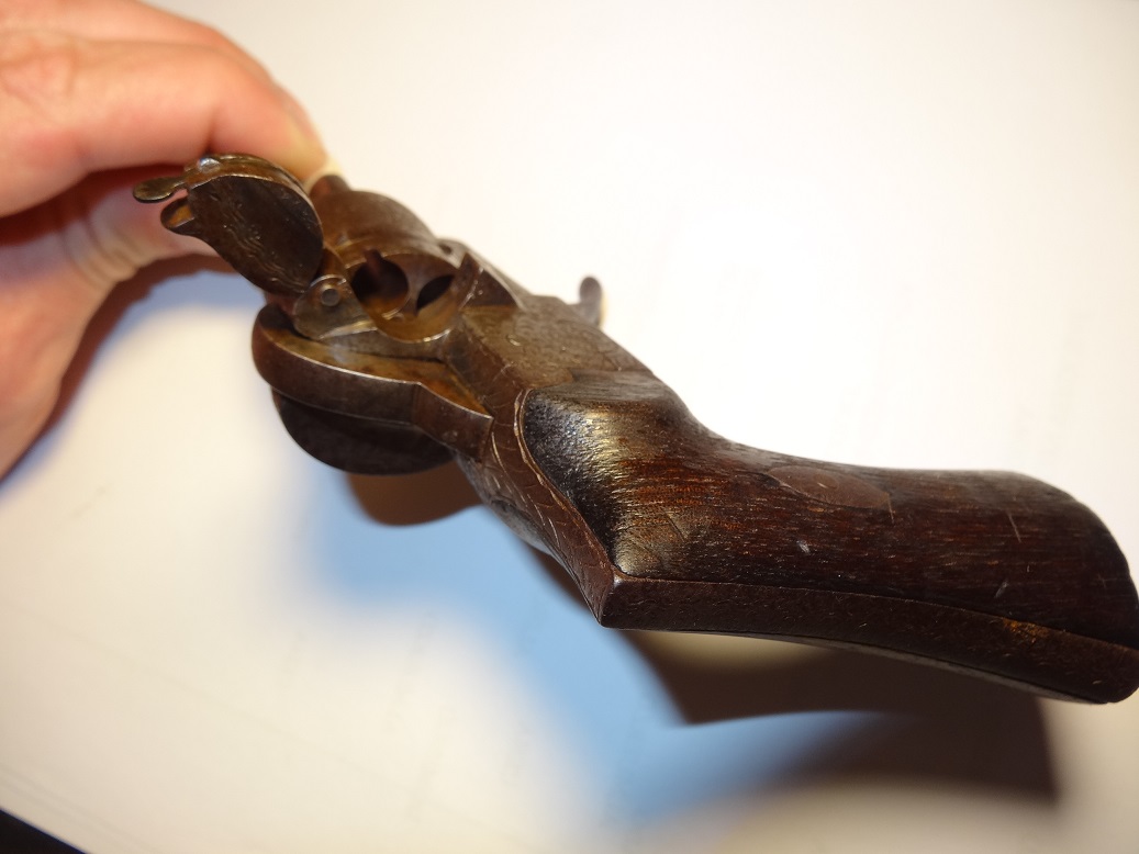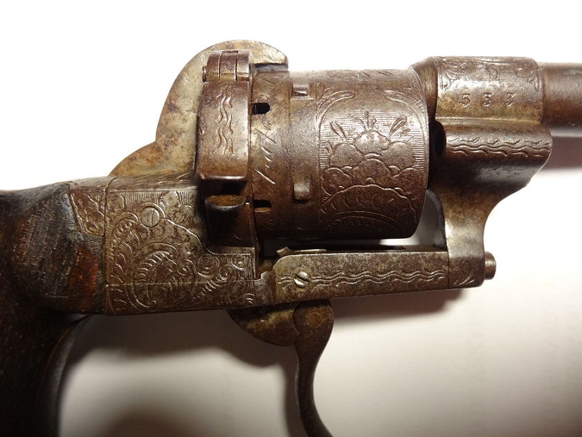 Se trata de un revolver sistema Lefaucheux, de los que se fabricaron muchos a partir de mediados del XIX en tierras vascas. Los hubo de muy diferentes calidades. Desde hierros de balcón sin ningún valor hasta algunos copia de los reglamentarios (modelos 1858 y 1863) que se fabricaban en Trubia (Asturias). Es un arma de bolsillo de doble acción con disparador escamoteable.