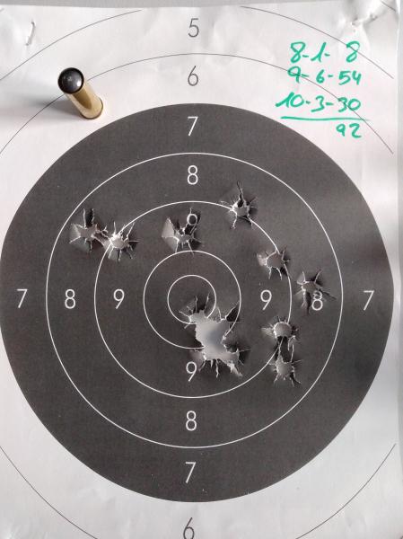 No conservo datos y hablo muy de memoria, con la carga "universal" que preparo para mis armas del 45 colt (por aquel entonces punta fundida turquesa lee de 250gr, trefilada y engrasada a 452 y 3,6gr Ba10) recuerdo que agrupaba de forma mediocre, todos dentro del negro, pero con cargas mas pesadas y picantes (punta hn cobreada de .458-350gr trefilada a 452 o punta lee 452-300gr con gas check y unos 23-24gr de vectan SP3) agrupaba bastante bien, nueves y dieces.