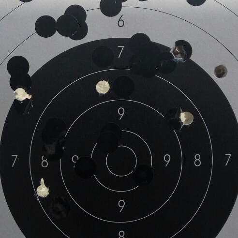 - Bola .457, 140 gr, 38gr FFFg, 322 m/s, lo que hace 471 julios, no es aún carga máxima, está carga es la que peor agrupó y se corresponde con el blanco siguiente: