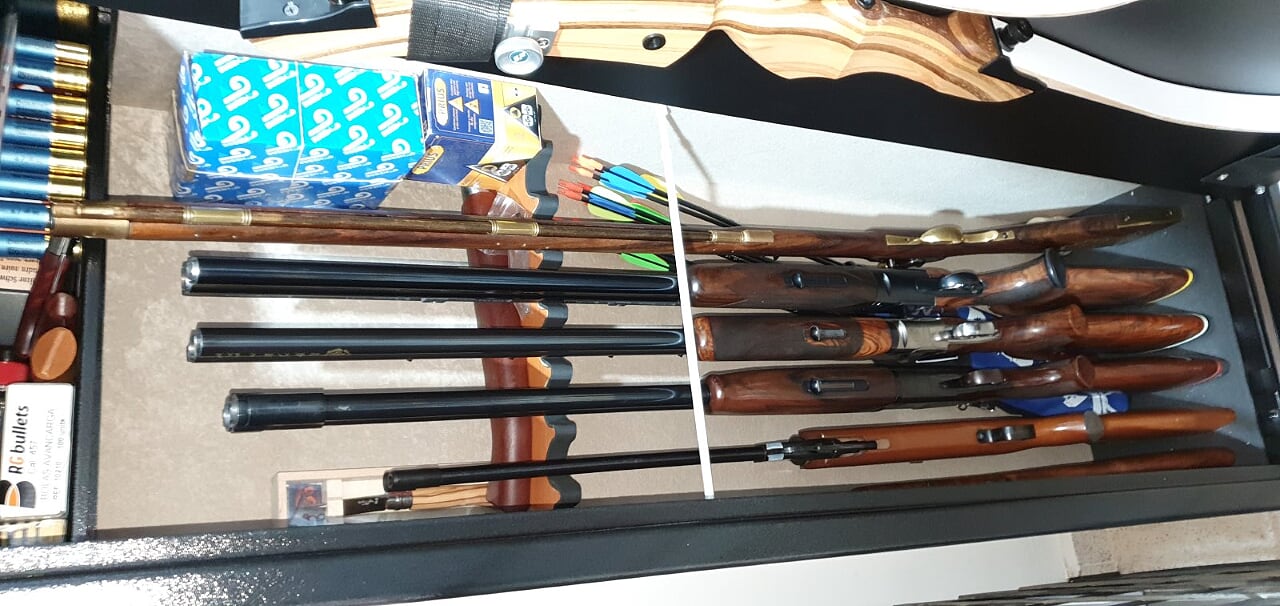 Estos rifles de avancarga mas que guardados en un armero son para tener expuestos en una pared. Es mas fácil que un atracador o un terrorista utilicen un cuchillo antes que un Hawken o un Kentucky. No me imagino a un delincuente que después de atracar una gasolinera se ponga a cargar con pólvora, poner la bala y atacarla con la baqueta y luego ponga el pistón para tener un disparo con el que enfrentarse a la policía. De todas formas de las mentes pensantes que hacen nuestros reglamentos se podría esperar cualquier cosa.