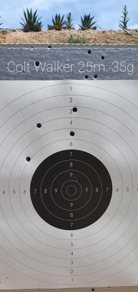 Buenas compañeros, no me pude creer el resultado que tuve, a 25mts con el Walker, solo hice 5 disparos, y fuí cogiendo referencia de miras hasta poder meterlo en el 10, con 35 grains de polvora, 20 de semola y bola H&N del 454.