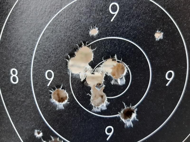 Pues eso, desde que he cambiado a bolas del calibre .445 no consigo obtener un resultado coherente. Estoy usando un calepino de lino de 0.35 mm aproximadamente que me hago yo mismo mojado con agua y jabón y cargas que van de 40, 50 y 55 hasta 60 greins de pólvora suiza nº 3 con una vaina del 38 de sémola. Ninguna carga se comporta más o menos igual de un tiro a otro. Con todas las cargas tan pronto coloco una bola en el 10 como al siguiente tiro se me va al 5, tan pronto disparo alto como bajo. No consigo obtener ningún patrón que me indique que debo modificar para mejorar los resultados.