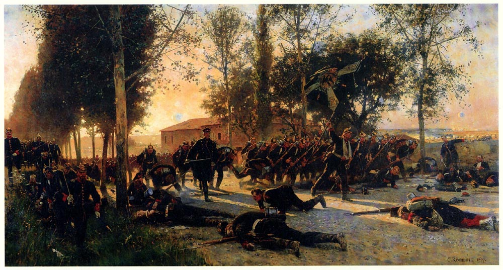 La campaña de agosto se inicia en Alsacia con las primeras derrotas francesas en Woerth y cerca de Reichshoffen. Bajo el mando del general Bazaine una parte del ejército francés se repliega hacia Metz, donde se librarán varias batallas decisivas el 16 y 18 de agosto de 1870. A pesar de que los franceses logran mantener las posiciones, no aprovechan su éxito por la falta de tropas de reserva y de un mando decidido. La tarde del 18 de agosto se entabla un combate entre el 94 regimiento de línea francés (6º Cuerpo comandado por el mariscal Canrobert), atrincherado en Saint-Privat, y la infantería enemiga. Tras una hora de combates encarnizados, la guardia real está diezmada. La artillería prusiana toma el relevo y ochenta cañones bombardean intensamente el pueblo. Los últimos defensores franceses abandonan un Saint-Privat en llamas a la caída de la noche. Pero la derrota del 6º Cuerpo cuesta a los prusianos 10.400 hombres. Al día siguiente el rey Guillermo telegrafía a la reina Augusta: "mi guardia ha encontrado su tumba en Saint-Privat". Las tropas francesas se refugian dentro de Metz, de la que sólo saldrán ya para rendirse. Se atribuye a la estrategia de Bazaine la derrota del ejército del Rhin. Acusado de alta traición, Bazaine es juzgado por haber entregado Metz y es condenado. En 1881se evade del fuerte de Sainte-Marguerite, donde estaba encarcelado y se refugia en España.