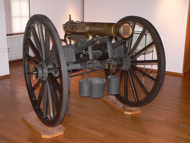 La ametralladora pesada De Reffye fue usada por los franceses durante la contienda de 1870-71 y se accionaba a mano. Este nuevo ingenio, pesado y muy mal utilizado no dio los resultados que se podrían esperar. Tenía 25 tubos de 13 mm, que tiraban 5 series de 5 cartuchos. Su cadencia era de 130 disparos por minuto y su alcance de 1.100 m. Pesaba 800 kg y era arrastrada por 6 caballos. Usaba el cartucho semi-metálico 13x87R De Reffye, con culote de latón, cuerpo de cartón y bala de plomo envuelta en papel.