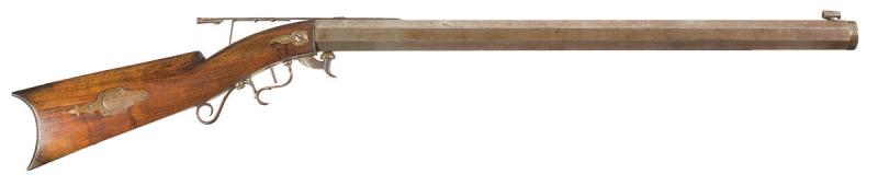 Historical Flint M-1867, Extra Heavy Barrel Target Rifle. Description: The top of the barrel is marked \"E. FLINT\" followed by \"1867 (an image of a hammer) 8\". The right flat at the breech is stamped \"REMINGTON\", so the barrel was made by Remington and the gun assembled by FLINT. It features a turned muzzle for a bullet starter, with a globe and pin front sight and an adjustable bar peep sight, there is no provision for a ramrod. The stock has an iron scroll target type trigger guard, toe plate, side plates, cap box and crescent buttplate with a nickel silver inlay of a squirrel on the left buttstock. The consignor believes that this rifle was produced by D.H. Hilliard and has found reference to a Captain E.A. Flint as serving with a Massachusetts cavalry unit who had an outstanding record in U.S. Civil War. Condition: Very good. The barrel and mounts are \"in the white\", with the barrel turning slightly brown and the corners on the flats are still sharp. The rest of the iron mounts show a little more smooth patina. The otherwise fine stock has possibly been lightly cleaned, with very few handling marks. Mechanically fine. The gun is big, and weights 22 pounds by my bathroom scale. It is one heavy dude. It has real near tang rear sight, it flips up and has a pinhole to sight through. It is not fit for a false muzzle. It is .45 caliber with an excellent bright bore.