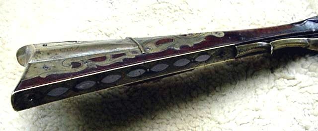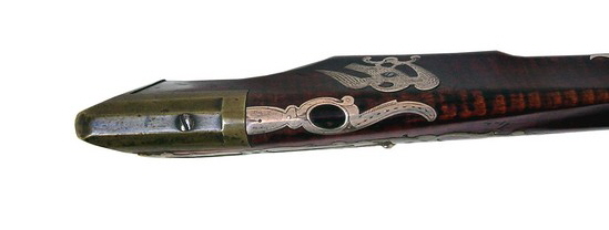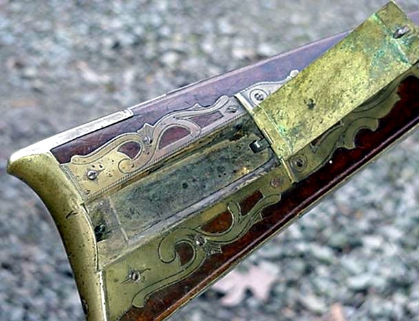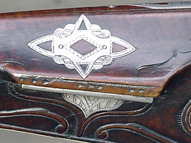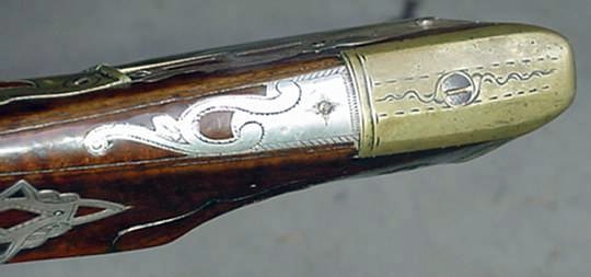 Siguiendo el tema de la decoración de estilo casi chillón, una placa de plata para mantener la selección touchhole está claramente garantizado en la pieza de la mejilla que se adorna con una calada y grabada incrustaciones de plata en forma de una estrella estilizada. En la cura de la pieza de tope se encuentra una incrustación de plata calada y grabada y que se distribuyen en el peine. El bien diseñado y ampliamente grabado, y fueron traspasados de parches de latón cuadro está inscrito con las iniciales de los fabricantes en la tapa, una práctica común en Carolina del Norte. Una de las características más elaborado es un dedo extendido placa de bronce con incrustaciones de plata, con siete óvalos, grabado en un patrón de líneas entrelazadas grabado. El calibre .40 barril es de 48 pulgadas de largo.