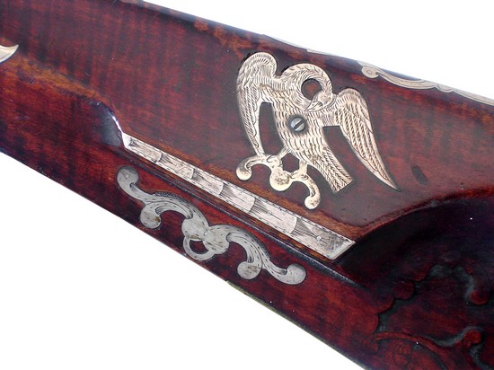 El fusil ha sido reconvertido a piedra. Tiene una longitud total de 59 pulgadas, con un 43 ¼ pulgadas inundado octogonal calibre .45 profundamente estriada barril. Tiene doble juego desencadenantes y cuñas barril ciego. La culata es de 1 ½ pulgadas de ancho y 4 pulgadas de alto. Cuenta con 24 incrustaciones de plata finamente grabado incluyendo la pieza del pulgar ovales y embutido en el cañón a la firma, lugar y fecha. Arce rizado La acción está muy bien planteado y grabados tallados y bien equilibrado, aunque pesa unos 9 kilos.