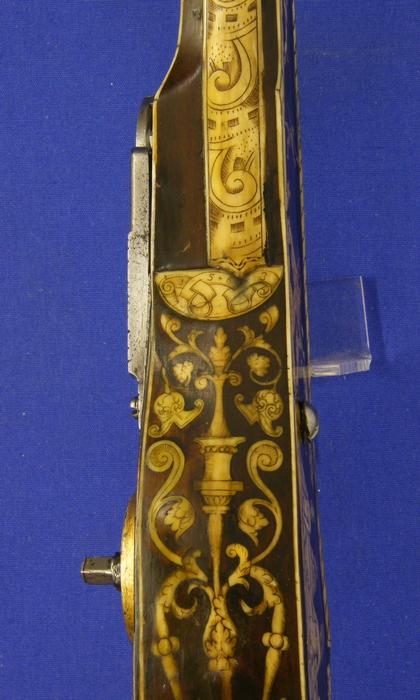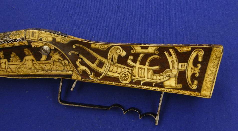 Un rifle aleman de llave de rueda por Johann Ville en Giessen, calibre 15 mm. y 115 cm de largo. Proviene de la Armeria de sus Altezas los Principes de Zalm /Reifferscheidt/Dyck y se vendio en Christie´s London 23 september 1992.