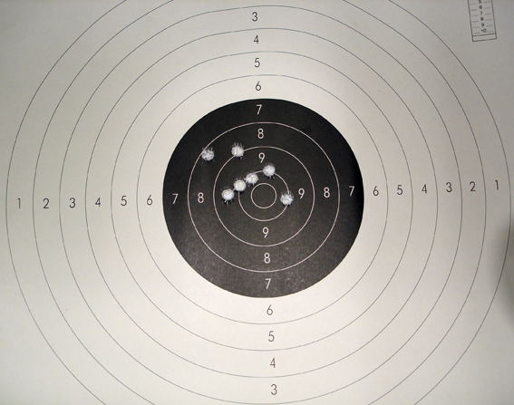 Como os podréis figurar hay otra diana, que es la primera, en donde hay tiros mas desviados, que por supuesto son los de la puesta a punto, que los he hecho yo para ir rectificando hasta conseguir que los disparos obedezcan, y una vez conseguido se cambió la diana y en ese momento comenzo a disparar el alumno con el resultado que veis...como ya he dicho solo tres son mios.