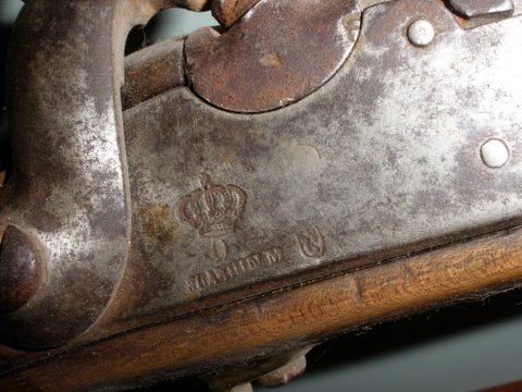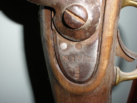 Como se puede apreciar por la O coronada fue fabricada en su día en la Fábrica de fusiles de Oviedo. El apellido del armero no se identifica bien, pero es casi con toda seguridad un apellido de origen vasco, esto era muy normal. También parece que la fecha de fabricación es 1855, pero se vé todo muy borroso.