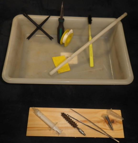 Como puedes ver, en esto se resume el rollo de antes. cubeta donde te quepa el revolver, el soporte de madera, grata, llave multiple para quitar las chimeneas, teflon para despues colocar en la rosca de las chimeneas, baqueta de nylon con su lavador hecho a base de lima, dosis de plastico par la carga de polvora, jeringa con vaselina para sellar las chimeneas, cepillo de dientes, unas pinzas para dejar caer el proyectil en el tambor, destornillador,...