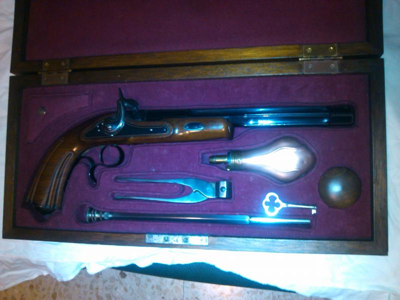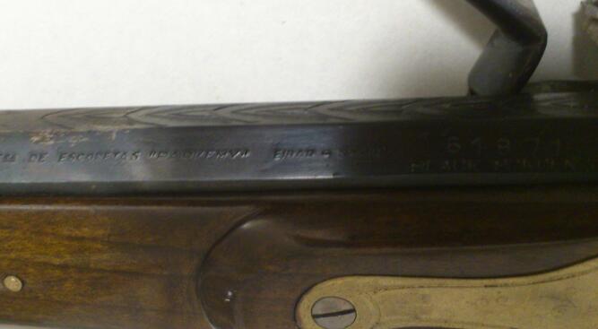 Si uno se fija bien el cacharro parece un hibrido entre una imperio de ARSA y la Europa de ARDESA, pero con un pico curvo particular, en el extremo del guardamano. El estuche desde luego tiene las mismas caracteristicas que los de ARSA, sobretodo la turquesa, la polvorera, la baqueta, y la cajita portapistones de madera.