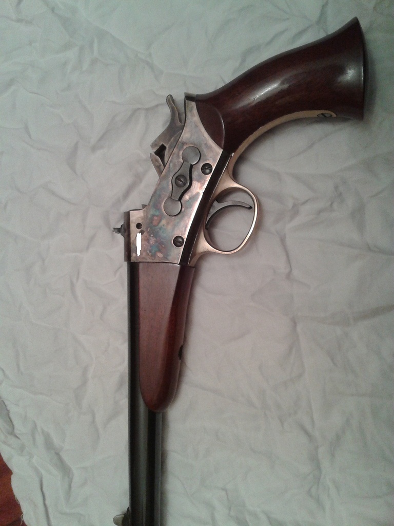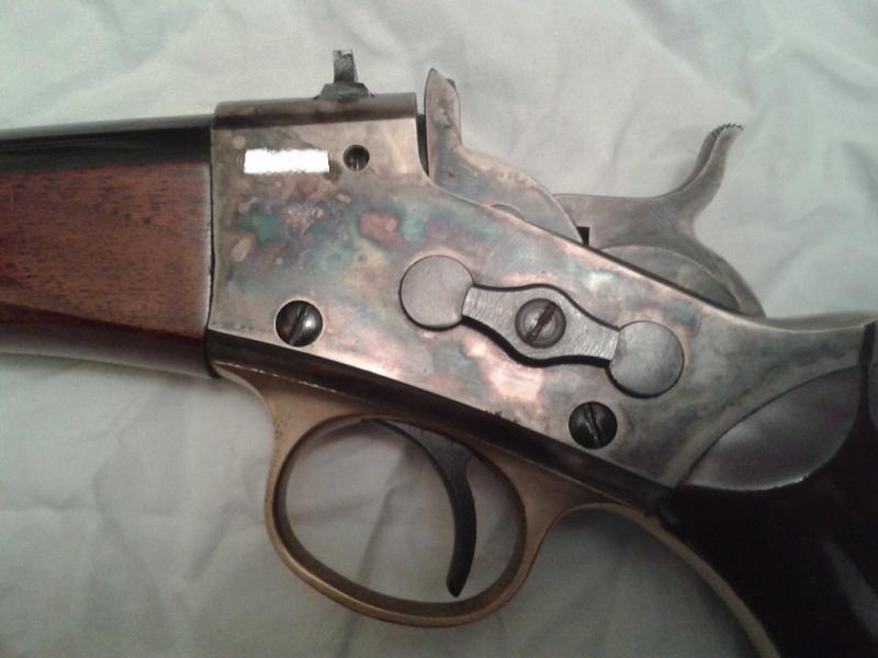 Es de la casa Uberti, el modelo remington de sistema Rolling Block en 45 Colt. Tiene una pequeña pega, por el momento no se fabrican en este calibre. Son muy difíciles de encontrar, mas de 3 años me costo dar con esta