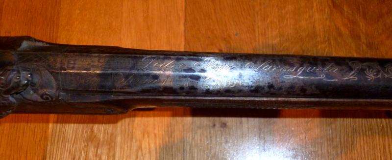 Por cierto, a la familia Sarasqueta la conocía, pero busco al tal Pedro José y no me aparece por ningún lado. Apart de que me dice la wiki que el fundador de la fábrica de Eibar, Víctor, nació en 1864 y la escopeta es de 1838... a no ser que sea el nombre del propietario el que aparece grabado. Ya de paso comento que está grabado en letras doradas, puede que de pan de oro, no sé si lo apreciáis sobre el cañón.