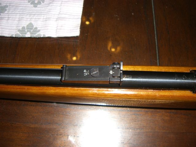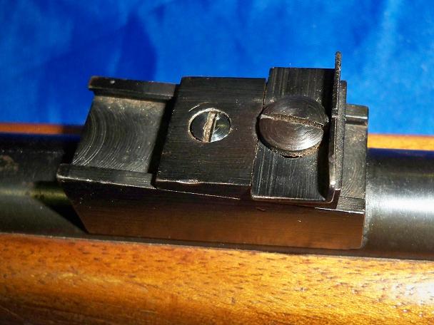 Se trata de una carabina archiconocida por todos vosotros menos por mi ya que no la había visto "in person" hasta la fecha. Imagino que originalmente el punto de mira era la típica pieza de cola de milano como la que montaba la Cometa V y similares. Este punto de mira que lleva parece estar pegado con alguna cola o pegamento de los que se cristalizan del tipo del Loc Tite. La sacaré, lo limpiaré y le haré una pieza como la original, pues supongo que encontrarla será harto dificil.