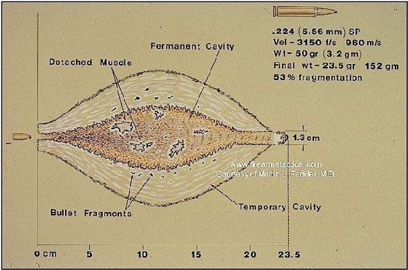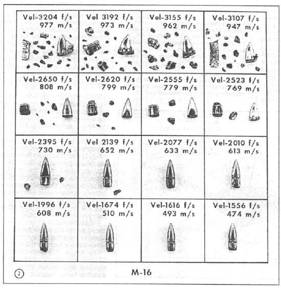 La cuestión del 5,56 es que su poder de parada se basa en la fragmentación del proyectil. Al impactar, el proyectil voltea y se rompe por la banda de forzamiento convirtiéndose en metralla la base del proyectil. PERO esto solo ocurre a partir de unos 650 m/seg. El proyectil sale por el cañón de un M16 a unos 1000 m/seg, pero pierde velocidad rápidamente, por eso a unos 300 metros puede que ya no presente fragmentación, por lo que tienes un .22 puro y duro.