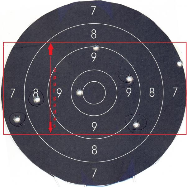 Por cierto, si ese es el blanco de precisión para pistola que usamos a 25 metros la distancia entre tus dos rayas rojas horizontales no es de 2".