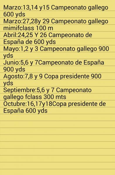 La primera prueba del año llegaría a finales de abril, en la que sería, además, otra de las pruebas novedosas, el Campeonato de España de Rifle F-Class 600 yardas. La sede propuesta para albergar esta prueba, sería Parga (Lugo).