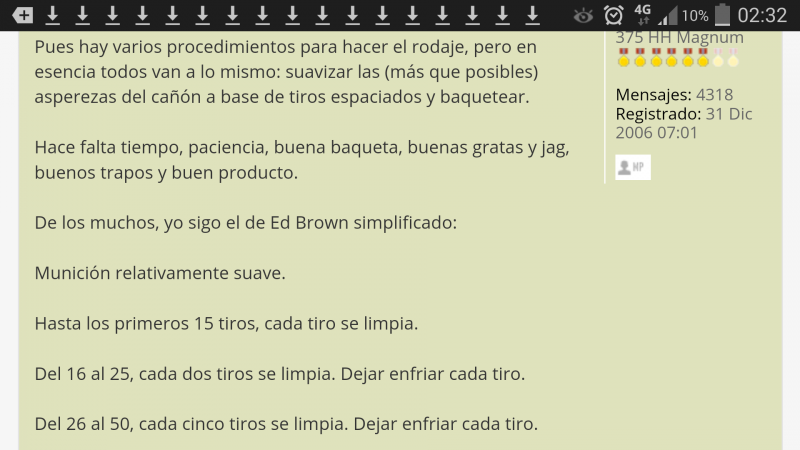 Si le has pegado 5 o 10 o los que sea disparos antes de empezar el rodaje no pasa nada excepto que ya tiene todas las pequeñas aristas y grietas llenas de cobre por lo que las sucesivas balas que van pasando no las van limando nada asi que toca limpiar bien a fondo (igual hacer como 3 limpiezas a fondo seguidas) para eliminar hasta la mas minima mota ajena al acero del cañon y asi ya poder empezar el rodaje en condiciones.