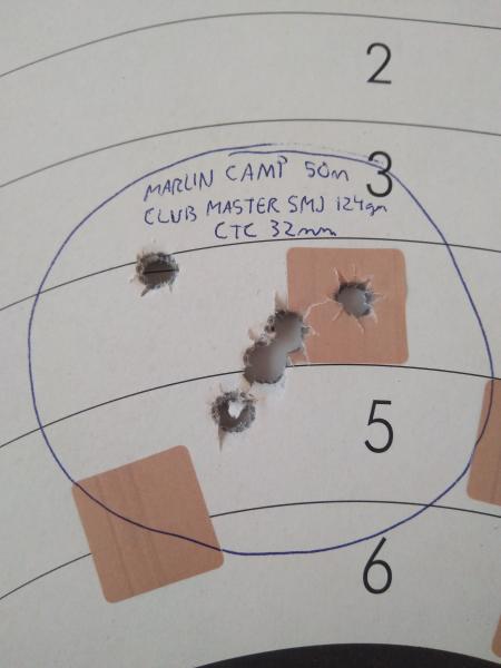 Municion Gamo Club Master SMJ 124gr, CTC 23mm (uno de los disparos tiene que estar doblado, era la primera agrupacion y en el resto de la diana no estaba)