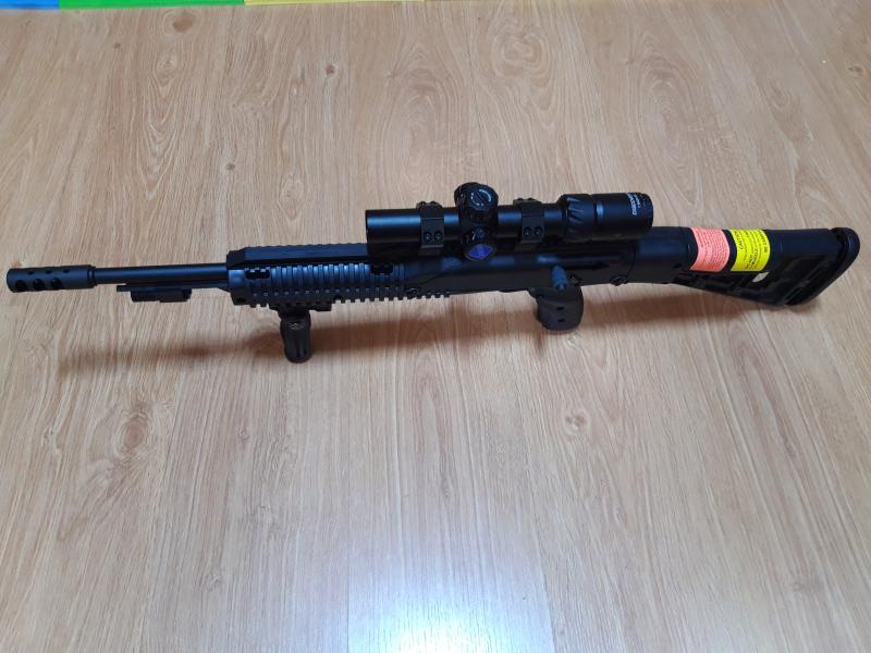 Le he puesto una empuñadura retráctil, punto rojo laser bajo el cañón, freno de boca, que por cierto tengo 2 más por si a alguien le interesan, le he eliminado los elementos de puntería que traía de fábrica y le he colocado un visor de batida marca Discovery modelo 1-6x26 HD con retícula iluminada, que por cierto me han parado en la aduana y me tocado pagar suplemento.