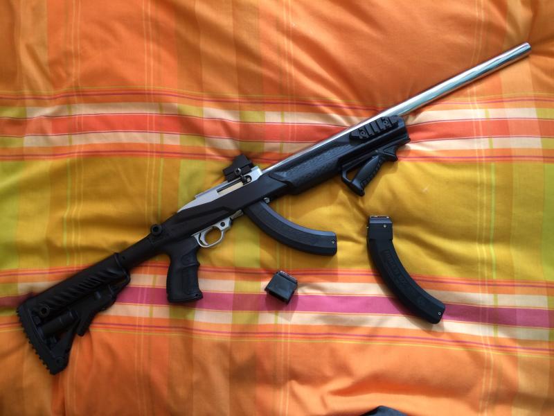 colito escribió:Mi Ruger 10/22. Bocacha M4, retenida de cargador sobredimensionada Volquartasen, palanca de montar alargarga Skeleton, rail picatiny, Anillas Warne, un cargador Buttler Creek con labios de metal y dos Ruger B-25, Harrys(Chino), Eotech original, visor Nikon, carro aligerado y rebajado en chaflán para mejor enfrentamiento con el martillo, culata Hogue y pintura antioxidante aplicada por electrolisis.