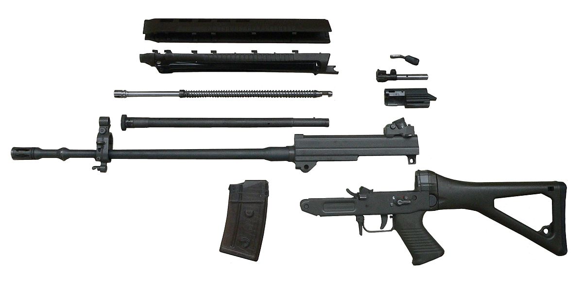El único parecido que veo es que ambos tienen piston de tirada larga y la cabeza del cierre de los Sig 550. Pero estos son de los años noventa los Sig o swiss 500 (stg 57) más antiguos no tenían este sistema, eran rodillos. Es problable que Sig le copiase a Kalashnikov? Pues puede como también puede o que se fuesen aún mucho más atrás en el tiempo, al diseño original de la cabeza rotatoria en el Mannlicher M1895 o M95 de la que han salido todas las demas, AK, AR y demás.