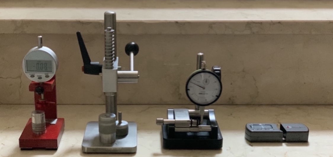 De izquierda a derecha: Medidor de culotes, recalibrador de puntas, verificador de la concentricidad de los proyectiles respecto a las vainas y balanza para pesaje de los cartuchos.