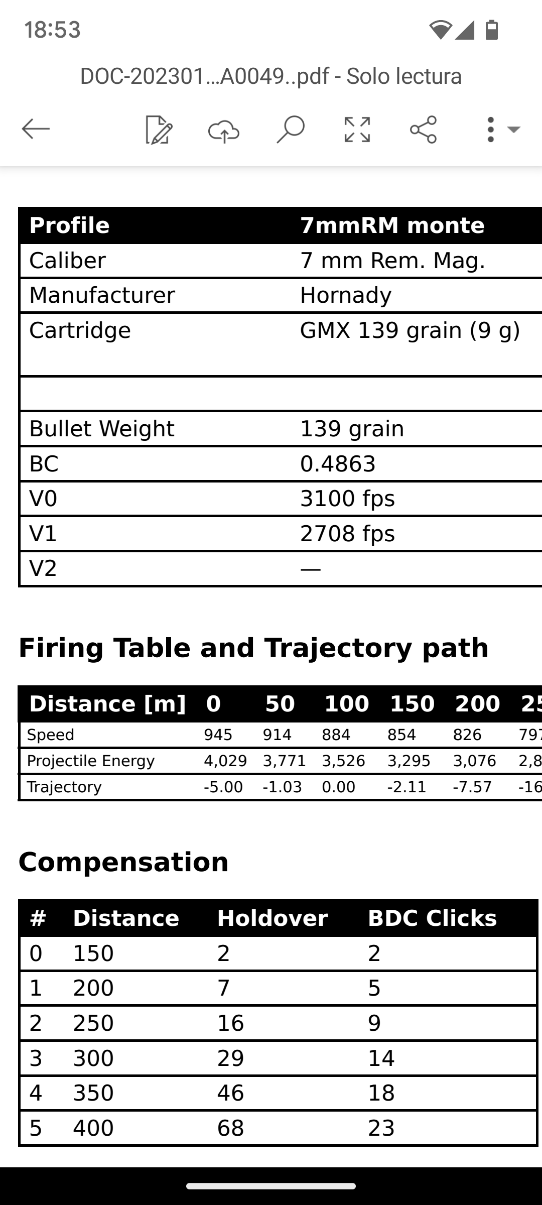 En la primera foto resumo los datos de la tabla de Swarovski. Esos si están bien, si no se me ha trabucado algún numero, creo que no. Indico la caída de la bala y la corrección en cm de la torreta (lo saco del programa de Swarovski todo).