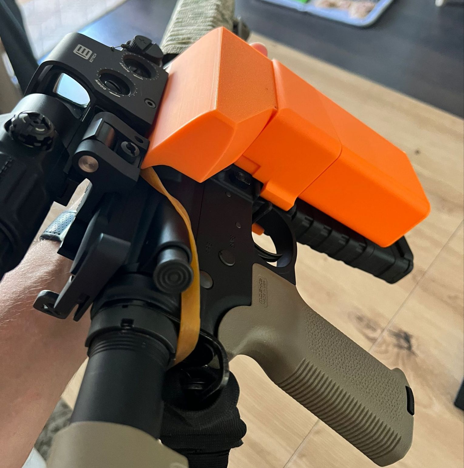 Por cierto, aprovecho que estoy por aqui para comunicar que estamos haciendo unos diseños en 3d para recoger vainas en AR-15 con CERO interrupciones. No se trata de una red, que a veces se atasca con el mecanismo o incluso del calor las vainas se pegan en la malla. Es una estructura de plástico. tengo fotos de capturas de pantalla de videos del primero diseño, por lo que no tengáis en cuenta el color. Nos quedan algunas modificaciones más. SI queréis mas info, al whats app! (653418701) que esto no es un grupo de venta y perdón si me he extralimitado!