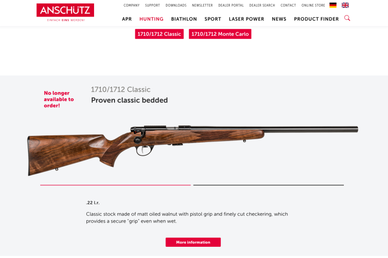 hoy estaba curioseando por la página oficial de Anschutz en Europa, y he visto que la 1710 aparece que ya no está disponible. Me he quedado un poco extrañado, porque tanto la versión clásica, como la culata Montecarlo han dejado de servirlas.