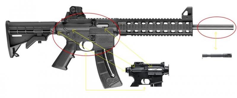 Aqui va una foto del MP15-22, resaltando algunas diferencias con el Colt/Walther. En la version original estas diferencias no existen.