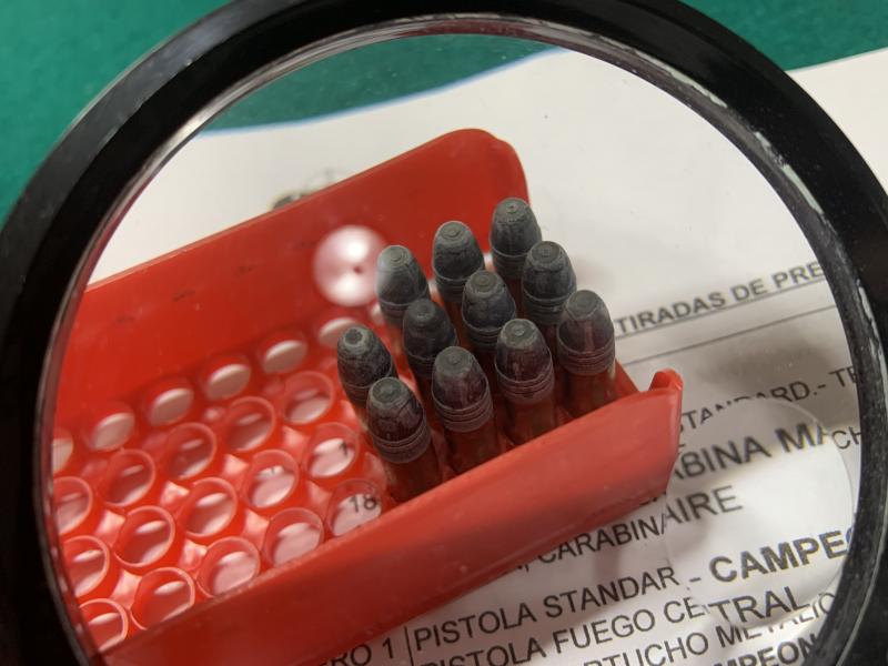 También tenía otro micrómetro ( de reloj ) que colocando la bala se podía hacer rotar con lo que además te daba que parte de la circunferencia del culote era mas baja o alta, las marcaba con un punto de rotulador indeleble y siempre las colocaba igual en la recámara.