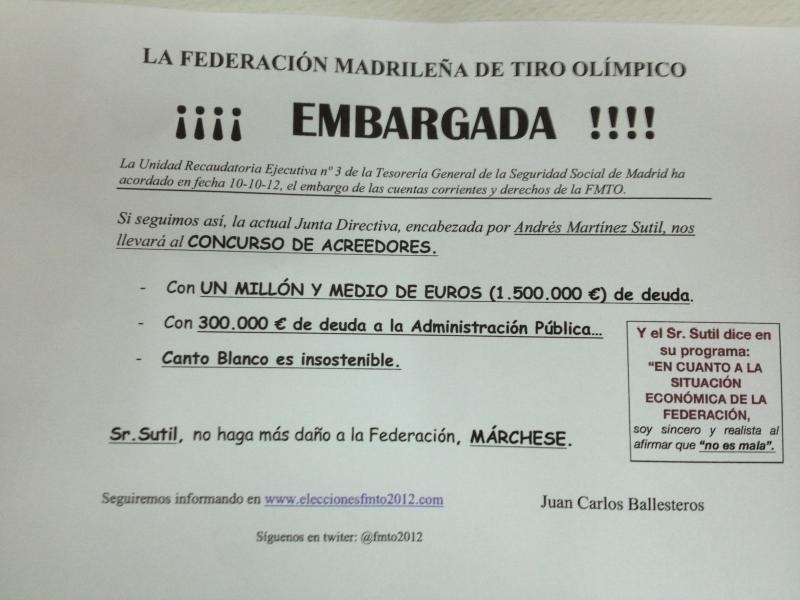 Hoy he estado en la tirada de 9 en FMTO y me han informado que se deben 300.000€ a la Seguridad. Por ese motivo la Federación ha sido EMBARGADA POR La Unidad Recaudatoria Ejecutiva nº 3 de la Tesorería de la SS. Me he ido al TABLÓN DE EDICTOS Y ANUNCIOS DE LA SEGURIDAD SOCIAL y en la página 16 viene el anuncio del embargo. Me he quedado sin palabras.