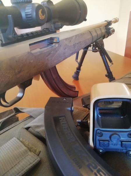 Mi Ruger 10/22. Bocacha M4 Retenida de cargador sobredimensionada Volquartasen Palanca de montar alargarga Skeleton Rail picatiny Retenida de correreda Volquartasen Anillas Warne Maxima Cargador Buttler Creek con labios de metal y dos Ruger B-25 Harrys(Chino) Eotech original Visor Nikon Carro aligerado y rebajado en chaflán para mejor enfrentamiento con el martillo Culata Hogue Pintura antioxidante aplicada por electrolisis.
