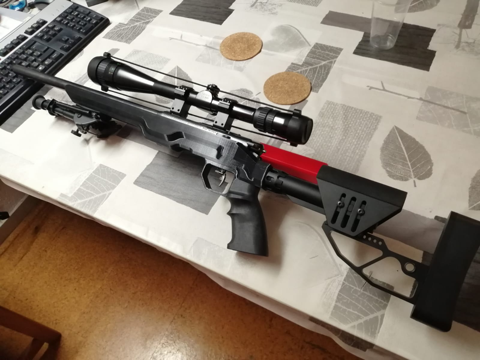 una vez en casa diseñe el chasis en 3d inspirándome en los chasis MDT y similares, lleva railes mlock inferiores, y un par de barritas de inoxidable por el interior que le dan un poco de rigidez. detras lleva la rosca para un tubo de culata de ar15.