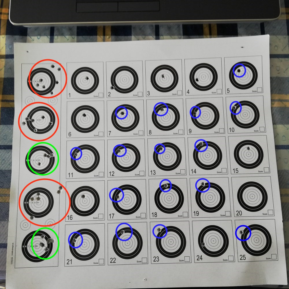 Si. Eso ya lo aprendí con la pistola. Cuando no lo hago bien se van abajo a la derecha y como verás en el montaje donde puse todos los impactos marcados en azul, se van arriba a la izquierda. Pero es que los que están en las dianas de prueba, no siguen ese patrón.