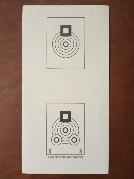 Mira. El blanco rectangular con dos mitades es el tradicional de Bench-Rest de 100 m, y que es el que usábamos en BR-50, tanto Open como Stock, a 50 metros con el .22 lr. En la mitad de abajo, que es de prueba, se pegan todos los tiros que uno quiera y en la de arriba, la de competición, sólo cinco. Puntúan los mm de centro a centro de los más distanciados y se suman los mm de cinco blancos. En el actual BR-50 ya no se usa. En el BR de fuego central sí.