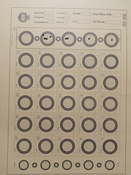 El más cuadrado tiene cinco blancos de prueba en columna, que uno puede usar como quiera. En este caso estaba probando otra munición y fui de abajo arriba. En el centro ves 5X5 blancos para un total de 25. Son 250 puntos. Ya no se tira BR-50 a grupos. Si se toca la mosca cuenta para desempates. La columna de la derecha también es para prueba. En inglés les llamamos "sighters".