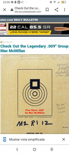 Para ir calentando el terreno pondré una foto que ya he puesto en este foro alguna vez y que algunos seguramente recuerdan. Es el récord mundial de Bench-Rest de MacMillan, el fundador de la marca, con un. 222 Rem antes de que vieran la luz los PPC.