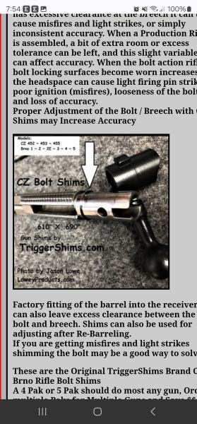 Pero entonces, si el problema es que vaya duro el cerrojo al cerrarlo, por poco head space, si intercalas una arandela calibrada en medio del cerrojo, adelantas la cabeza del cerrojo, e ira mucho mas duro todavía el cierre del cerrojo....