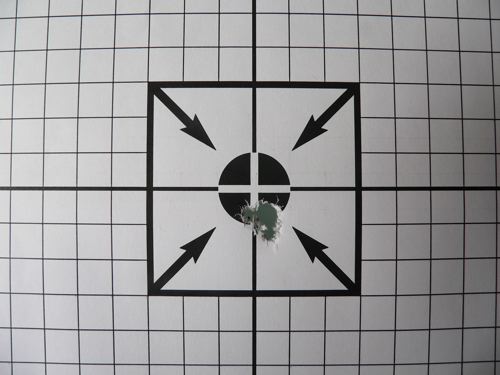 Por la medida de los impactos (unos 5 mm de diámetro ya que el papel cierra tras el paso del proyectil de 5,56)calculo que el círculo central tiene unos 30 mm de diámetro.