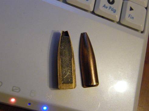Añado una foto con un ejemplo claro de masa descentrada en un proyectil, se trata de una punta del 9.3 en 232gn, las agrupaciones no es que fueran buenas de por si, pero solo subiendole unos 20m/seg en vez de grupos aceptables para caza parecian una tirada de postas