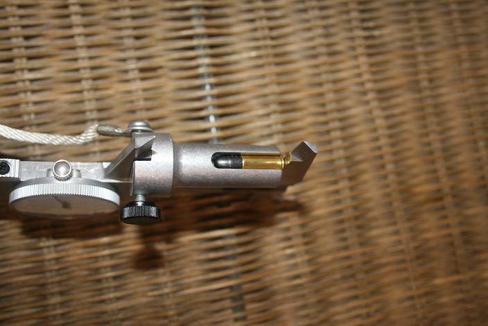 Se fija el medidor a la mandíbula de abajo del pie de rey. Se pone el cartucho como se ve en la foto y sobresale el culote. Si se ha puesto a cero con el medidor instalado pero vacío, el nonnio da la medida del culote.