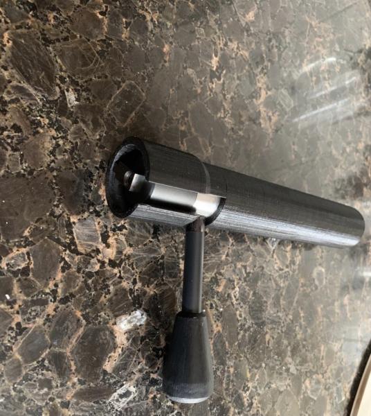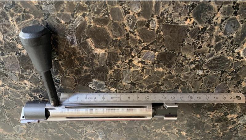 Detalle del mastodóntico cerrojo del rifle, con 3 tetones, 18 cm de largo y 3,9 cm de grosor: