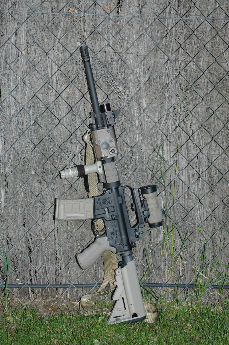 Tiene un disparador DPMS, kit KNS antirrotación, Grips Ergo, Railes Samson, Culata SOCOM, tubo y buffer LMC, Una Aimpoint Comp3ML, una linterna surefire, un grip genérico, y eso que parece un AN/PEQ-15, es una copia de 20 EUR de los chinos que dejo de funcionar al 5º disparo. Ahora la uso para guardar chicles o la Boresnake, o para intimidar a los contrincantes en las tiradas de Open.