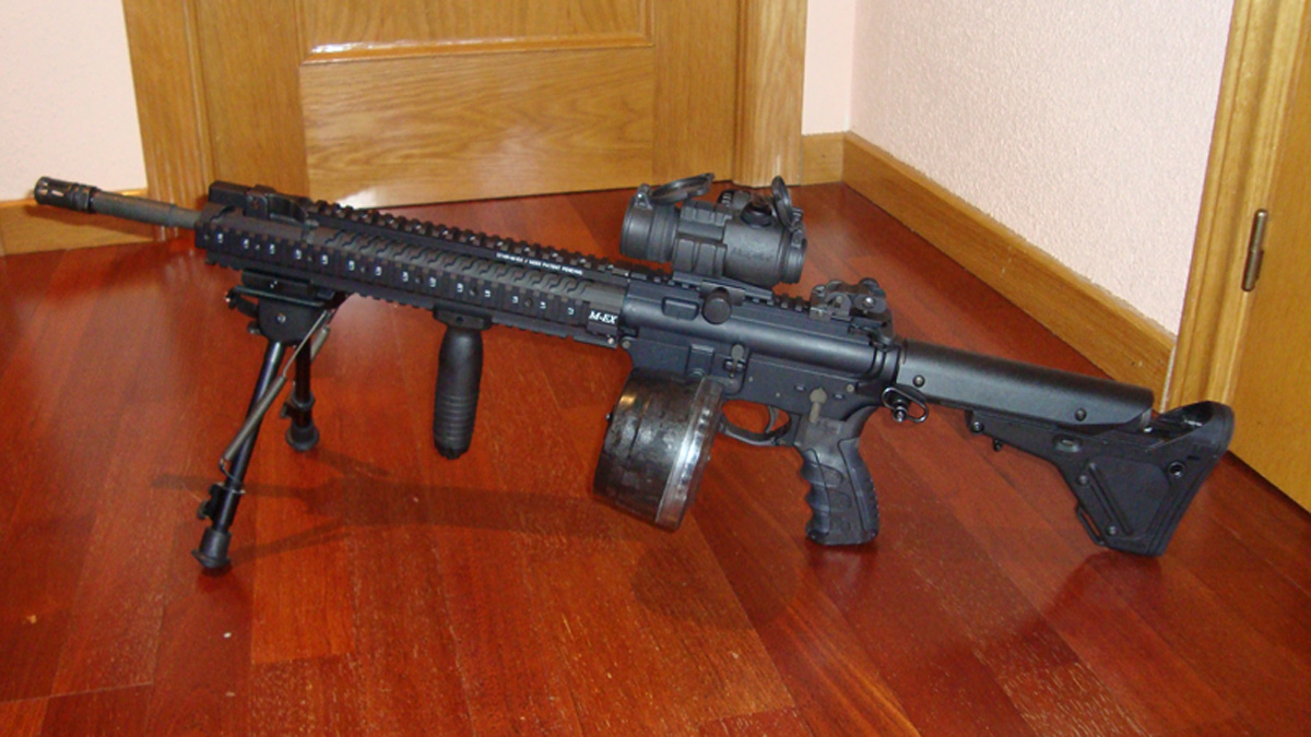 Bumba es un Sabre Defense M5. Lleva lo justo, ya que tiene un cañón pesado de 16" y si te pones a meterle cosas acabas sin brazo de apoyo. Lleva railes Samson, miras YHM, un Harris, un Grip genérico, y una mira aimpoint Comp3ML. El pistolete es un CAA ajustable y la culata es una Magpul UBR y todo lo demás viene de serie, ya que para mi los Sabre salen perfectos de la caja, exceptuando la culata.