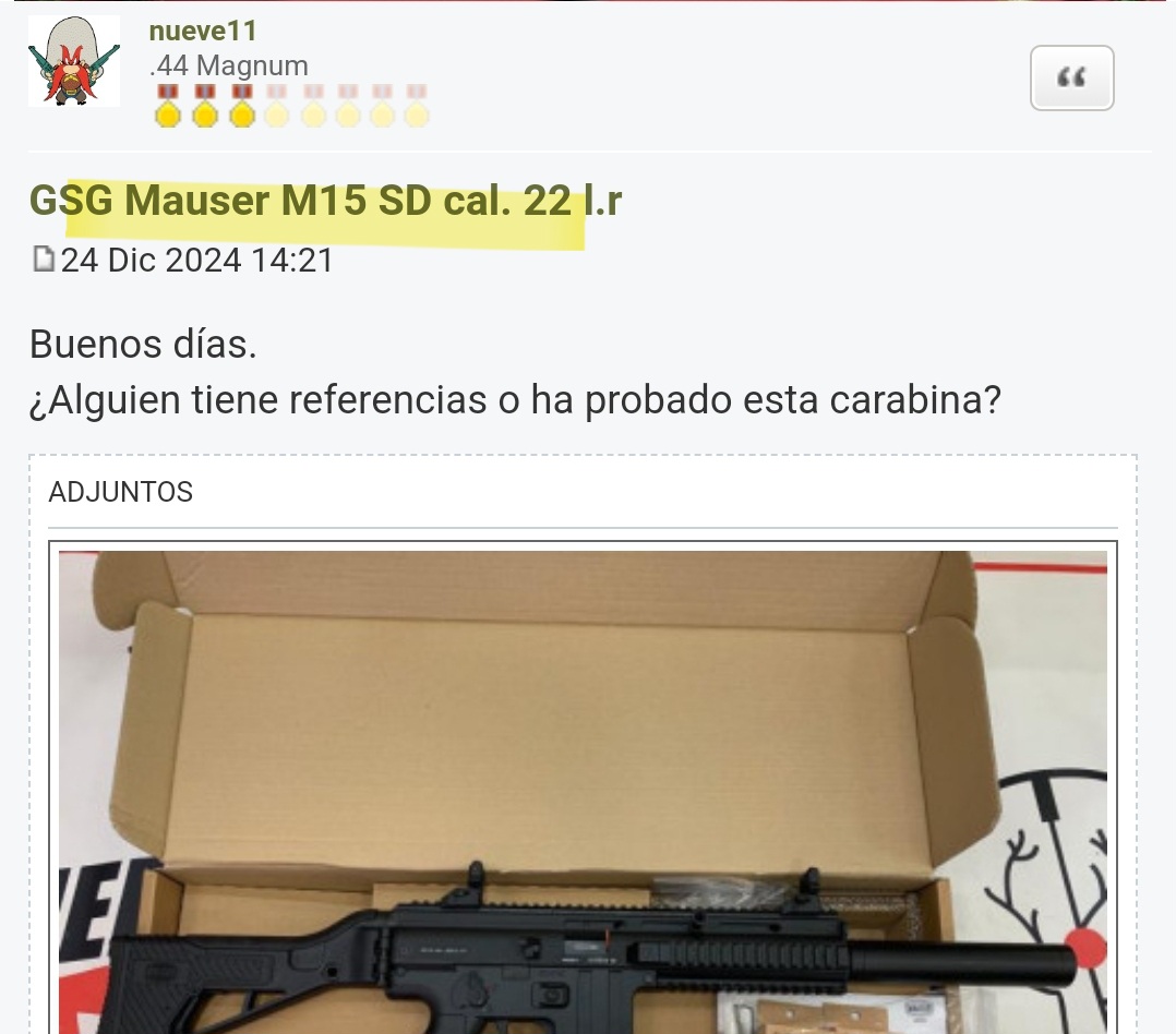 Dahaka escribió:Aquí cazador novel. Aún no tengo ni escopeta ni rifle para cazar, pero me he pillado mi primera 22lr para familiarizarme con las armas y demás.