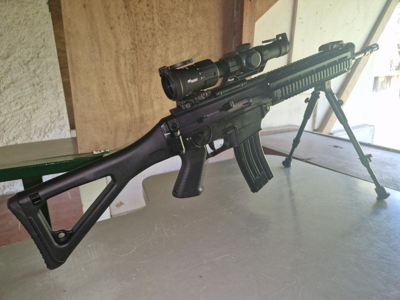 Como curiosidad la misma carabina pero con otro guardamanos, tipo "fishgrill" que venia con las SIG 556 originales vendidas en los USA, seguramente no hay muchos de estos guardamanos por aqui: