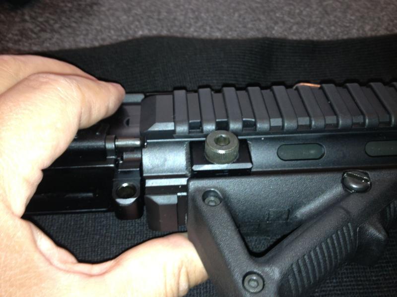 Presionando el interior del pasador con la herramienta conseguimos desbloquearlo y extraerlo. Esto no ocurre en la versión militar, el HK416, que tiene pasadores estandar como el resto de los AR15